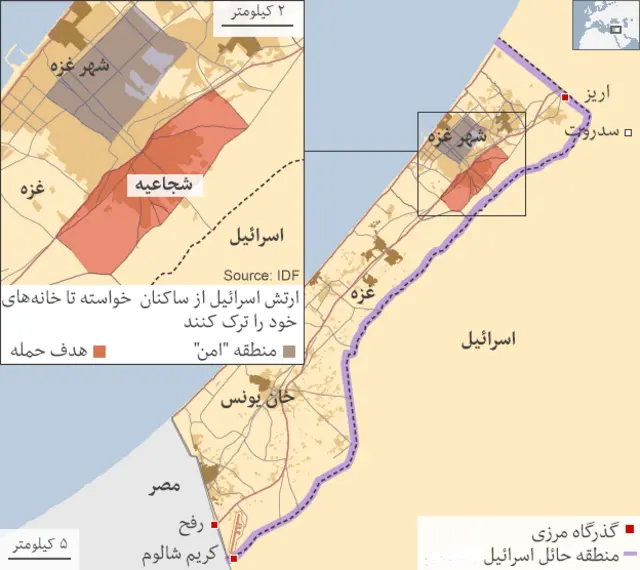 کامبیز فتاحی، خبرنگار بیبیسی فارسی که به منطقه شجاعیه رفته، آنجا را به محلهای زلزلهزده تشبیه میکند که در بعضی نقاط آن بوی جسد به مشام میرسد. او میگوید مردم مشغول کندن زمین برای دفن عزیزانشان بودند. عکسهای کامبیز فتاحی از شجاعیه را <bold><link type="page"><caption> اینجا</caption><url href="http://www.bbc.co.uk/persian/world/2014/07/140726_l45_gaza_photo_album.shtml" platform="highweb"/></link></bold> ببینید.