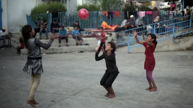 کودکانی که خانوادههایشان مجبور به ترک خانههایشان شدهاند، عید فطر را در یکی از مدارس سازمان ملل در جبالیا جشن میگیرند.