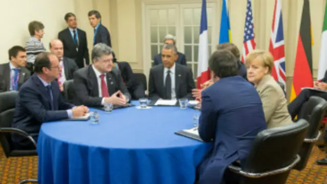 همزمان پترو پروشنکو، رئیس جمهوری اوکراین، در یک کنفرانس مشترک خبری به همراه آقای راسموسن، تاکید کرد که اوکراین خواهان صلح است و گفت که او هر چه در توان دارد به کار خواهد بست تا از جنگ جلوگیری شود. او همچنین گفت که به مذاکرات با فرستادگان روسیه و نمایندگان شورشیان طرفدارر روسیه در مینسک که قرار است روز جمعه (۵ سپتامبر) صورت گیرد خوشبین است.