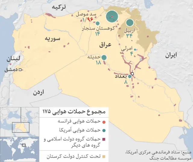 همزمان، خبرگزاری فرانسه به نقل از منابعی در اقلیم کردستان عراق گفته است که هواپیماهای ائتلاف مناطق تحت اشغال نفرات دولت اسلامی در داخل خاک عراق را هم بمباران کرده و شماری از آنان را کشتهاند.