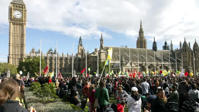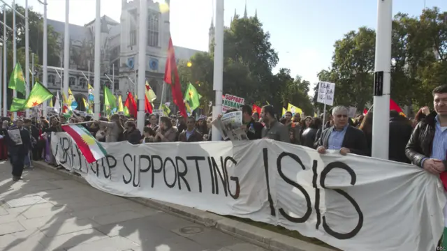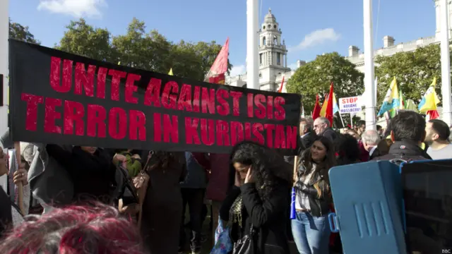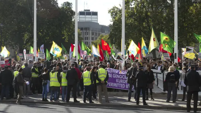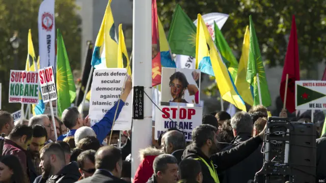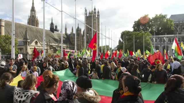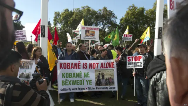 شماری از هواداران کردهای کوبانی در مقابل پارلمان بریتانیا تظاهرات کردند. آنها خواهان پیشتیبانی از گروههای کرد مسلحی هستند که در مقابل پیکارجویان گروه موسوم به دولت اسلامی هستند. آنها همچنین به سیاست دولت ترکیه در این زمینه معترضند.