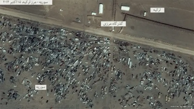 یک اردوگاه بزرگ آوارگان در سمت ترکیه منطقه مرزی دیده می شود. از آغاز پیشروی نیروهای داعش در کوبانی بیش از ۱۶۰ هزار نفر از این شهر فرار کرده اند.