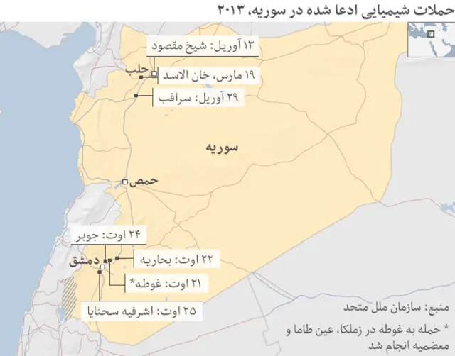 در ماه اوت ۲۰۱۳ بر اثر شلیک راکتهای حاوی گاز سمی سارین به چند نقطه در مناطق روستایی حومه شهر دمشق صدها نفر کشته شدند. قدرتهای غربی واکنشی خشمگینانه به این حملات داشتند و اعلام کردند که فقط حکومت سوریه میتوانسته است به چنین حملاتی دست بزند. اما رژیم سوریه و روسیه به عنوان یکی از کشورهای حامی آن، شورشیان مخالف بشار اسد را مسئول حملات خواندند.