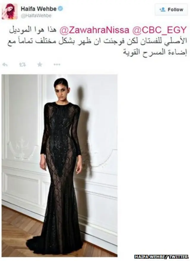 شبکه تلویزیونی مصری سی بی سی که برنامه مسابقه استعدادهای موسیقی عربی را پخش می کند به خاطر ظاهر شدن هیفا وهبی در اين برنامه با انتشار بیانیه ای عذرخواهی کرده است. خود خانم وهبی نحوه نورپردازی صحنه را مقصر دانسته و در توییت خود نوشته که لباس او در اصل بسیار پوشیده تر است "و از ظاهر لباسش تحت تاثیر نور شدید صحنه بسیار تعجب کرده است."