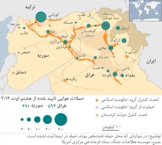 با وجود این حملات، این گروه همچنان بخشهای وسیعی از خاک سوریه و عراق، از جمله شهرهایی مهم چون موصل را در اختیار دارد.