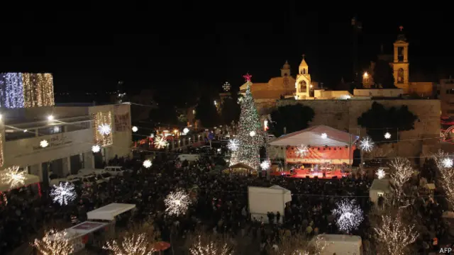 پیشتر، هزاران زائر در میدانی در این شهر کرانه باختری اشغالی و در اطراف یک درخت کریسمس غولپیکر که با رنگ های پرچم فلسطینیها تزیین شده بود، جمع شدند.