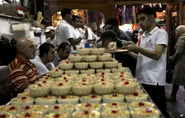 کنار همه خیابانها، وسط ایستهای بازرسی و مردان تا دندانمسلح، دستفروشها، ثعلب داغ حلب میفروشند. کافهها و قنادیها پر از شیرینی است. بستنیفروشی معروف بکداش مثل همیشه شلوغ است.