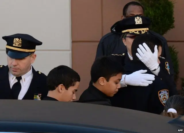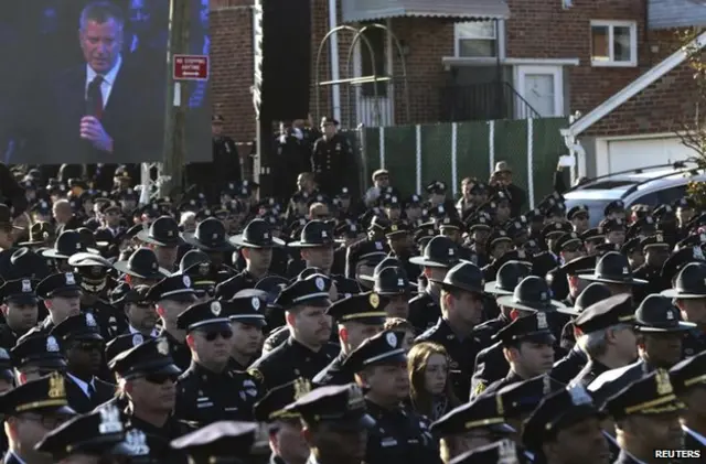 دهها هزار نفر از جمله ماموران پلیس سایر شهرها در مراسم خاکسپاری رافائل راموس، یکی از دو پلیسی که هفته گذشته بر اثر شلیک گلوله در نیویورک کشته شد شرکت کرده اند.