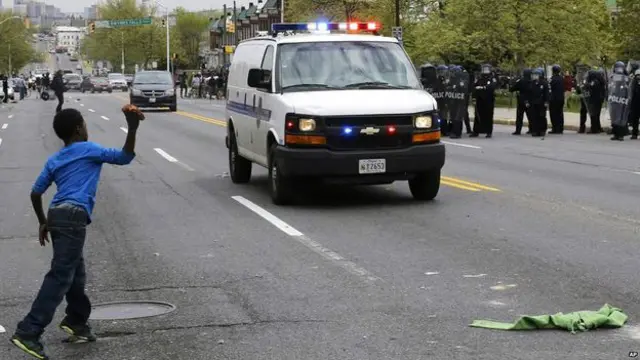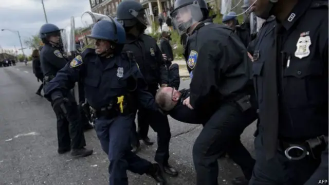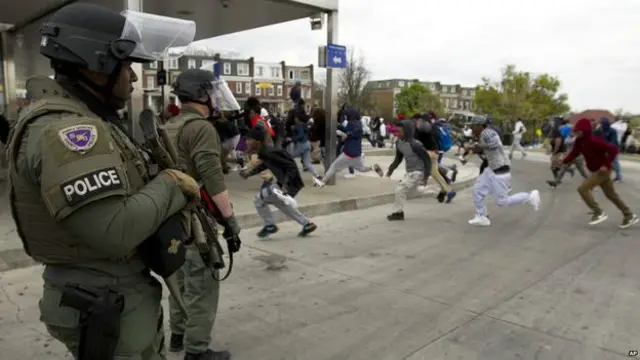 پلیس بالتیمور در حساب توییتر خود نوشته است کسانی که دست به خشونت زده اند به هشدار پلیس برای متفرق شدن اعتنا نمی کنند و چند افسر پلیس مجروح شده اند.