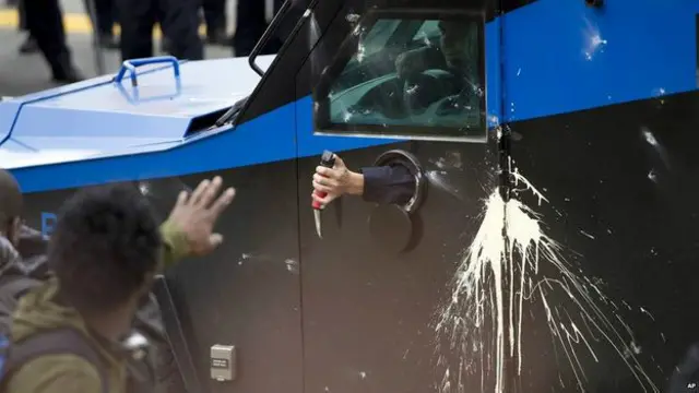 گزارش می شود که یک اتومبیل پلیس به آتش کشیده شده و یکی دیگر هم تخریب شده است. مقام ها می گویند که معترضان اقدام به پرتاب سنگ و آجر به سوی ماموران پلیس کرده اند.