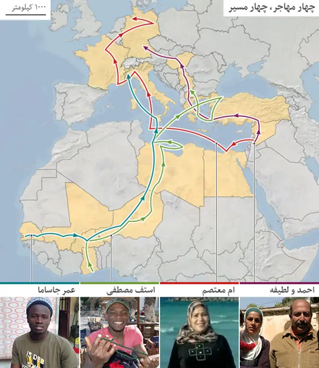 سالانه هزاران مهاجر از خاورمیانه و آفریقا تلاش می کنند خود را به سواحل اروپا برسانند. بسیاری از آنان از مسیرهای پرخطر مدیترانه عبور می کنند. فقط از ابتدای سال ۲۰۱۵ میلادی بیش از ۱۸۰۰ نفر از این افراد در حین سفر کشته شده اند. این آمار از دوره مشابه در سال گذشته ۲۰ برابر شده است. در زیر، چهار داستان از تجربه مهاجرهایی را بازگو میکنیم که به صورت فردی یا خانوادگی این سفر پرمخاطره را تجربه کرده اند، به این امید که آینده ای بهتر در اروپا داشته باشند: