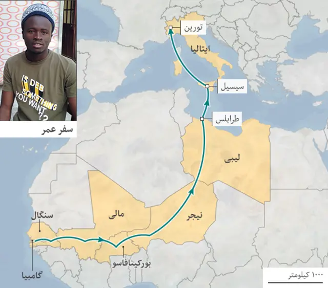 مسیر سفر: گامبیا به آلمان (گامبیا، سنگال، مالی، بورکینافاسو، نیجر، لیبی و ایتالیا)