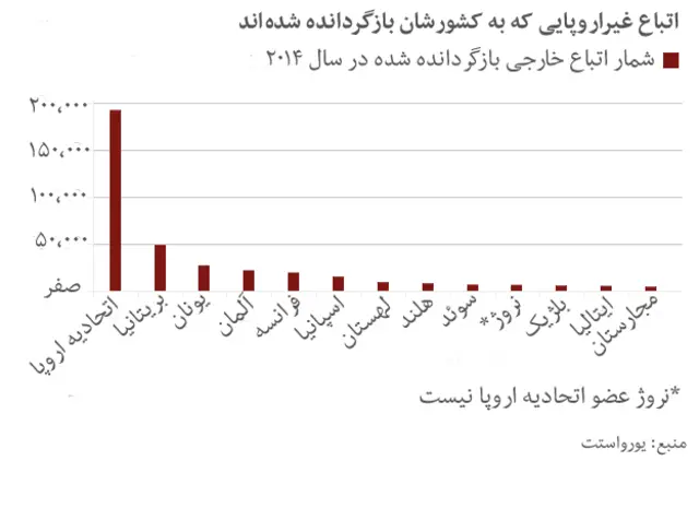 طبق آمار رسمی اتحادیه اروپا، سال ۲۰۱۴ بریتانیا بیش از هر کشور دیگر اتحادیه اروپا مهاجر غیراروپایی اخراج کرده - ۴۸۸۹۰ نفر از کل ۱۹۲۴۴۵ نفری که از اتحادیه اروپا برگردانده شدهاند. سال گذشته این رقم به ۶۵۳۶۵ نفر افزایش پیدا کرده.