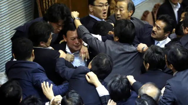 جلسه کمیته امنیت ملی سنای ژاپن برای بررسی مصوبه جنجالی اعزام ارتش به عملیات برون مرزی، به تشنج کشیده شد.