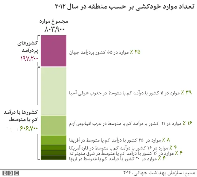 اما آمار خودکشی در کشورهای ثروتمند و متوسط/فقیر بهشدت فرق میکند، به حدی که ۷۵ درصد کل خودکشیهای دنیا در دسته دوم رخ میدهد.