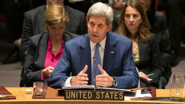 جان کری، وزیر امور خارجه آمریکا در جلسه شورای امنیت سازمان ملل متحد در حضور همتای روس خود گفت که اگر روسیه مناطقی را در سوریه بمباران کند که داعش و گروههای وابسته به القاعده در آن عملیات نمیکنند، در مورد انگیزه واقعی مسکو تردید به وجود میآید.