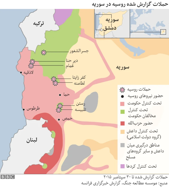 از روز چهارشنبه این هفته، هواپیماهای نیروی هوایی روسیه مستقر در پایگاههایی در خاک سوریه به بک رشته حملات هوایی در برخی نقاط این کشور مبادرت کرده و گفتهاند که هدف آنان انهدام مواضع شبهنظامیان گروه موسوم به دولت اسلامی (داعش) بوده است. با اینهمه، به گفته مقامات آمریکایی به نظر میرسد که حملات هواپیماهای روسی بدون هدفگیری مشخص صورت می گیرد و ضمن وارد کردن خسارات و تلفات سنگین غیرنظامی، به تضعیف بنیه نظامی داعش کمک چندانی نمیکند.