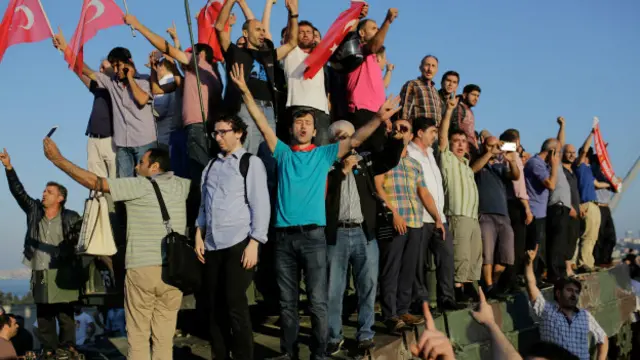 ابراز شادمانی مخالفان کودتا بر روی یک تانک تسلیم شده بر روی پل بسفر