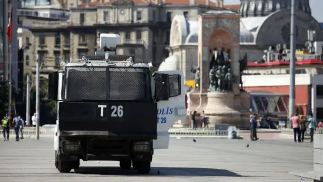یک نیروی پلیس ضدشورش بر روی تانک باز مانده از عوامل کودتا در استانبول