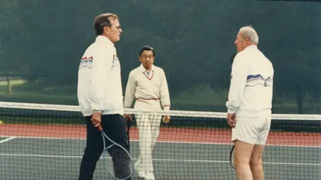 او در عین حال دو بار هم با جورج بوش پدر، رئیسجمهور سابق آمریکا، تنیس بازی کرده. آکیهیتو در هر دو بازی پیروز شد، اما حال آقای بوش درست بعد از بازی آنها در توکیو در ۱۹۹۲ در جریان مهمانی شام رسمی به شدت بد شد و روی کیایچی میازاوا، نخستوزیر ژاپن، استفراغ کرد.