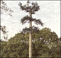در داخل سالن غذا خوری مدارس هم بچه ها به خبرنگاران تلويزيون گفتند همان سوسيس و سيب زمينی سرخ کرده چرب و چيلی را به اسپاگتی بولونز و سالاد کاهو و ميوه تازه ترجيح می دهند. اين هم داستان سوء تغزيه در اثر وفور نعمت و حتی با کمک دولت و سر آشپزهای معروف در اين جزيره. آنتن درختی! هفته پیش، درباره شورای شهر ایستبورن، شهر ساحلی در جنوب انگلستان گفتم که تصمیم گرفت تا معلوم شدن تاثیر امواج مایکرو ویو آنتنهای تقویتی تلفنهای همراه بر سیستم جهت یابی زنبورهای عسل، اجازه نصب این دکلها را نده. گویی که مهندسان فنی شرکتهای مخابراتی سایت فارسی بی بی سی را دیده باشند، چند روز بعد روزنامه ایندپندنت این عکس را چاپ کرد.
