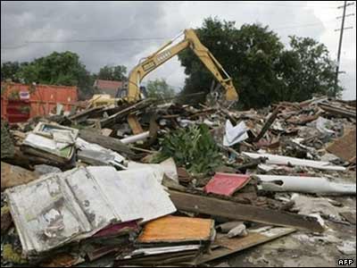در دومین سالگرد توفان کاترینا یک ماشین حفاری سعی می کند بقایای یکی از خانه های تخریب شده در نیواورلئان را جمع کند.