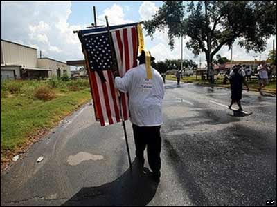 یک مرد آمریکایی، پرچم آمریکا در دست، می رود تا در مراسمی که برای دومین سالمرگ قربانیان کاترینا برگزار می شود، شرکت کند. | |||||||||||||||||||||||||||||||||||||||||||||||||||||||||||||||||||||||||||||||||||||||||||||||||||||||||||||||||||||||||||||||||