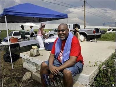 جیسون فریمن روی سکویی که دو سال پیش و قبل از توفان کاترینا، خانه اش بر روی آن بنا شده بود، نشسته است.