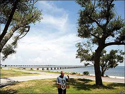 جورج بوش، رئیس جمهور آمریکا، در خلیج سن لوئیز در ایالت می سی سی پی سخنرانی می کند. او سعی کرد با وعده روزهای خوشتر در پیش رو، عصبانیت مردم نیواورلئان را تسکین دهد.