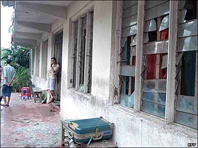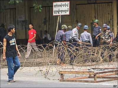 سربازان برمه ای با استفاده از سیم خاردار موانعی در اطراف نقاط مهم شهر از جمله ساختمان شهرداری ایجاد کرده بودند.