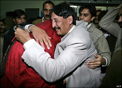پیکر بی نظیر بوتو، نخست وزیر سابق پاکستان، که روز پنجشنبه ترور شد از بیمارستان راولپندی در یک تابوت ساده چوبی حمل می شود.