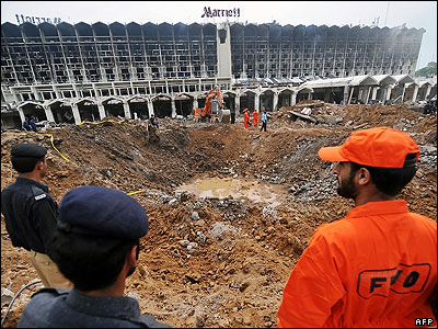 نمای ورودی هتل ماریوت اسلام آباد پس از انفجار. گودالی که در اثر انفجار ایجاد شده در عکس دیده می شود