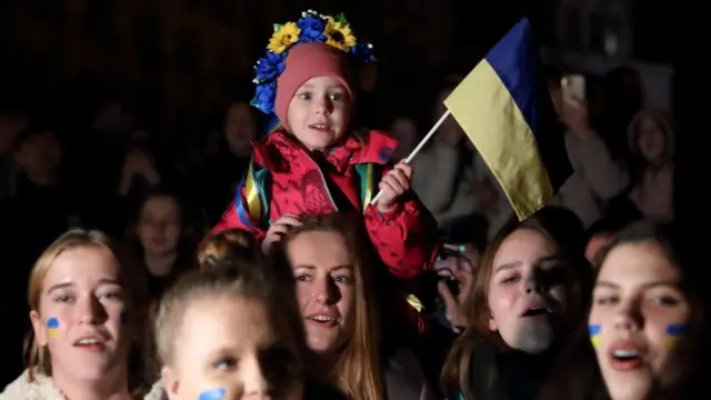 Video show as pipo for di streets fly di Ukraine national flag and dey chant as di Kyiv troops land.