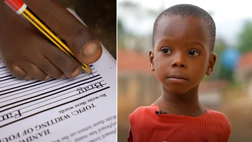 Witout hand, little Shindara dey use im leg write and im dream to become a lawyer always dey for im mind.