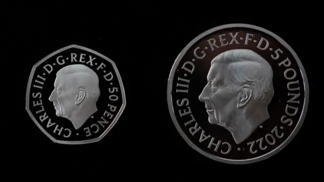 BBC News dey among di first to see of di 50p and a commemorative £5 Crown wey get one image of di King by British sculptor, Martin Jennings.