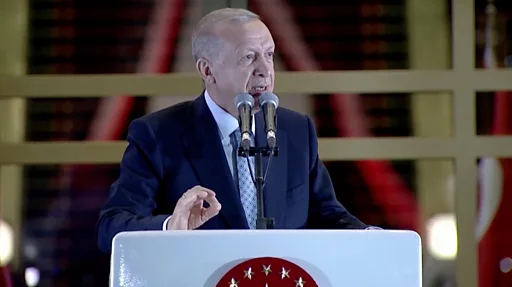 Di president celebrate im victory well-well, Im first speech to im supporters na ontop one bus for Turkey biggest city, Istanbul, afta dat, na wen im go im balcony for im palace to address im supporters wey reach about 320,000 pipo.