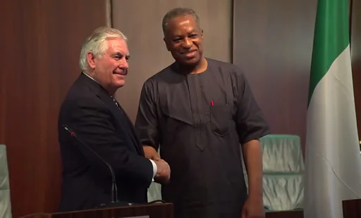 "We respect say na Nigeria government get di responsibility... but di way we support Nigeria na to give dem equipment, training, pipo for special operations, and sharing some kain information so as to ensure say dem get all di information for planning to take bring back di [dapchi girls], talk Mr Tillerson wey go return back to Washington today.