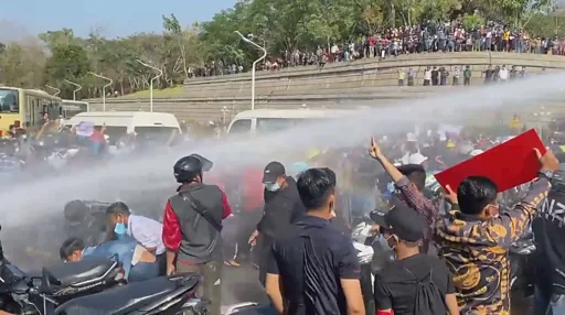 Kyaw Zeyar Oo, wey shoot di video, tell BBC say two vehicles bin don spray protesters wit "no early warning", as "di crowd dey peacefully protest in front of [di police]".