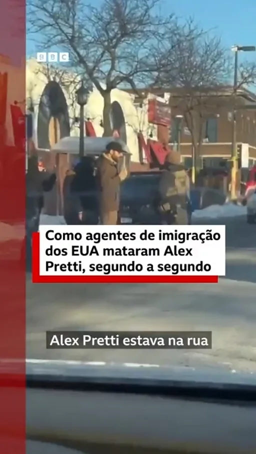 O BBC Verify, serviço de checagem da BBC, analisou sete vídeos do momento em que agentes derrubam Alex Pretti no chão e identificou que ele não estava segurando uma arma, segundo essas imagens.