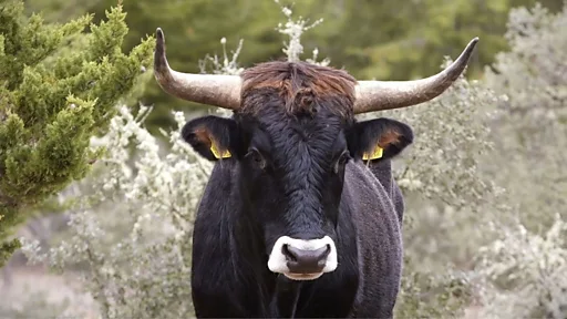 Mais ao sul, uma manada de grandes bovinos pretos e castanhos, com chifres longos, corre com agilidade. Conhecidos como tauros, esses bovinos são uma versão criada do extinto auroque, o ancestral selvagem da vaca moderna.
