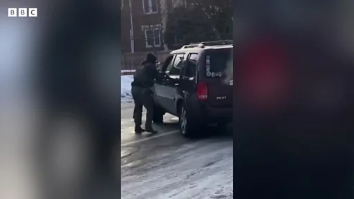 Veículos policiais aparecem nas proximidades. Agentes de imigração param ao lado do veículo estacionado na rua, saem da caminhonete e dizem à mulher ao volante para sair do carro. Um dos agentes puxa a maçaneta da porta do motorista.