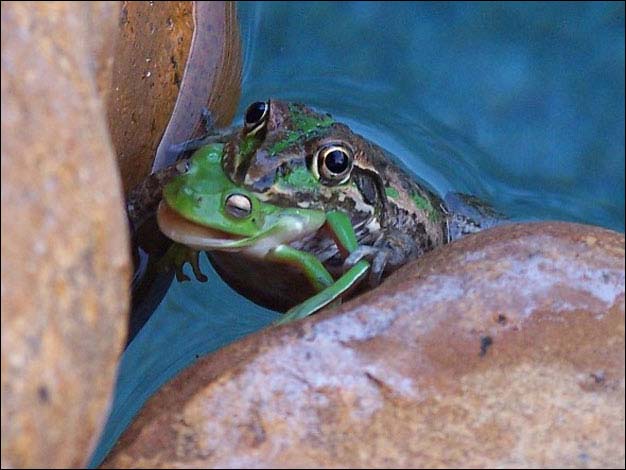 Kerry Roberts registrou o momento em que um sapo devora outro, em sua piscina