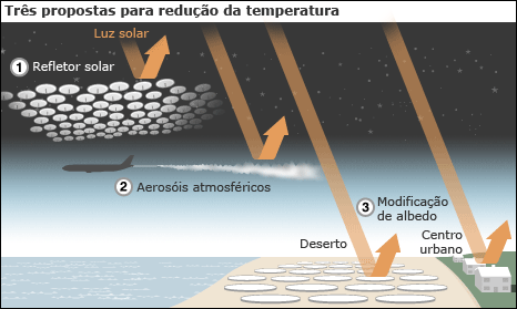 Isto poderia ser feito utilizando enormes refletores espaciais flexíveis (1) a serem colocados no espaço em órbita da Terra. Ou através de "aerosóis estratosféricos" que poderiam ser aplicados na camada superior da atmosfera (2) para retornar parte da luz incidente ao espaço. Espelhos refletores instalados no solo (3) poderiam obter efeito semelhante.