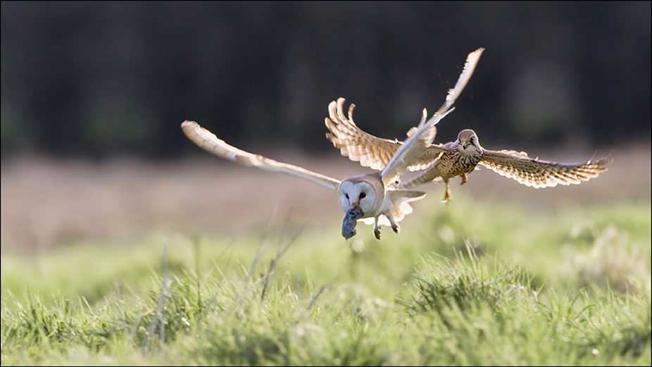 Outra finalista, a foto de Mark Hancox mostra um penereiro do dorso malhado perseguindo uma coruja das torres. Os juízes escolheram a imagem porque ela conta uma história.