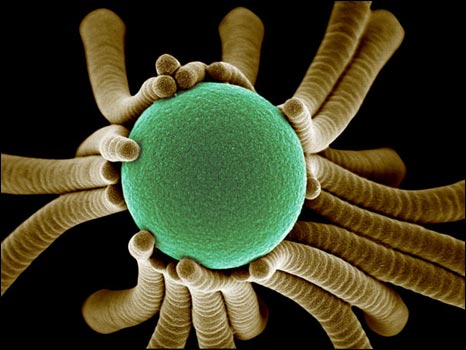 A foto de uma esfera verde microscópica envolta por fibras de polímeros com diâmetros equivalentes a 1/500 de um fio de cabelo foi a grande vencedora de um concurso anual promovido pela revista Science e pela Fundação Nacional da Ciência, dos Estados Unidos, para premiar imagens científicas.