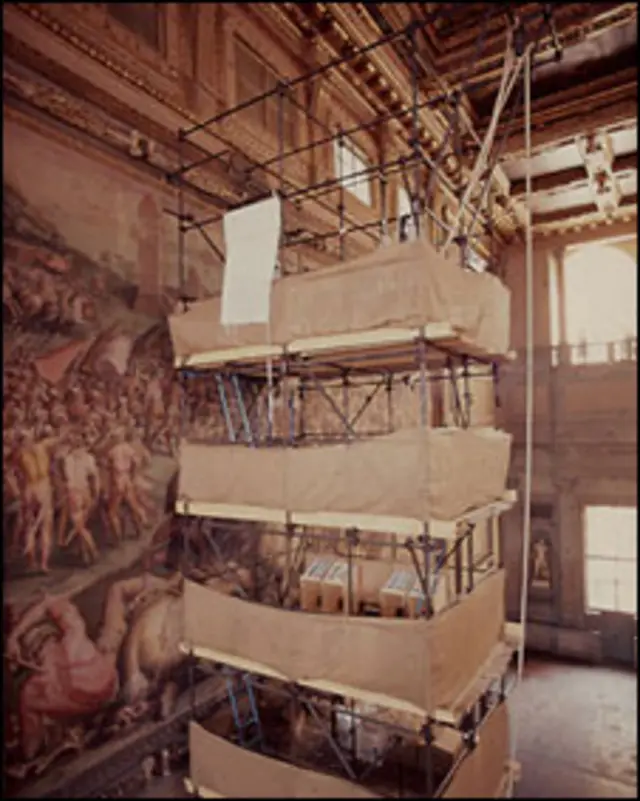 Não foi senão em 2000, quando já dirigia sua própria companhia de investigação forense de arte, Editech, que ele retornou com equipamentos que lhe permitiram reconstituir as reformas na estrutura do prédio e localizar uma estreita camada de ar por trás da parede em que as obras de Vasari estão pintadas.