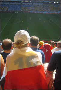 Aliás, fiquei impressionada com o Ronaldo. Não precisa ser nenhum especialista em linguagem corporal para perceber como ele está desmotivado. A cabeça baixa, os ombros caídos, os passos arrastados. Por sinal, no aquecimento ele era sempre o último nas corridas. A torcida brasileira tentou apoiar, gritando o nome do “fenômeno”, mas os australianos emendavam: “Ronaldo is a Pizza Hut! Ronaldo is a Pizza Hut!”. Como disse o meu colega Marcelo Crescenti, tem muito estrangeiro vestindo a camisa do Brasil. O problema é que a grande maioria não fala português e a torcida fica calada... Na minha frente estavam poloneses e turcos. A festa em Munique antes e depois do jogo de domingo era geral. Vários torcedores bebiam e cantavam juntos, apenas os poucos torcedores dos Estados Unidos eram todos vaiados.