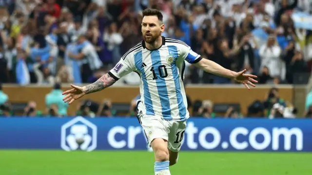 Legenda da foto, Messi comemora o primeiro gol da Argentina, ainda no primeiro tempo