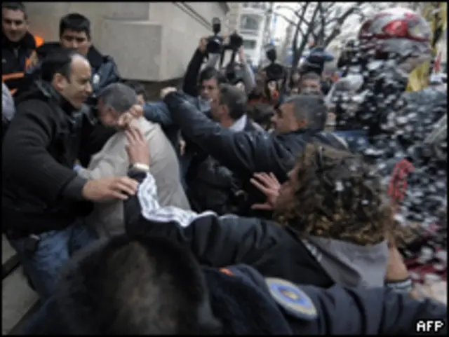 Em frente ao Tribunal, no centro de Buenos Aires, uma multidão erguia fotos das vítimas e jogou pedras contra o edifício.