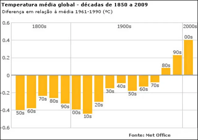 Isto quer dizer que esta década foi mais quente que os anos 1990, que ficou 0,23ºC acima da média usada para comparação e registrou, por sua vez, temperaturas mais altas que os anos 1980.